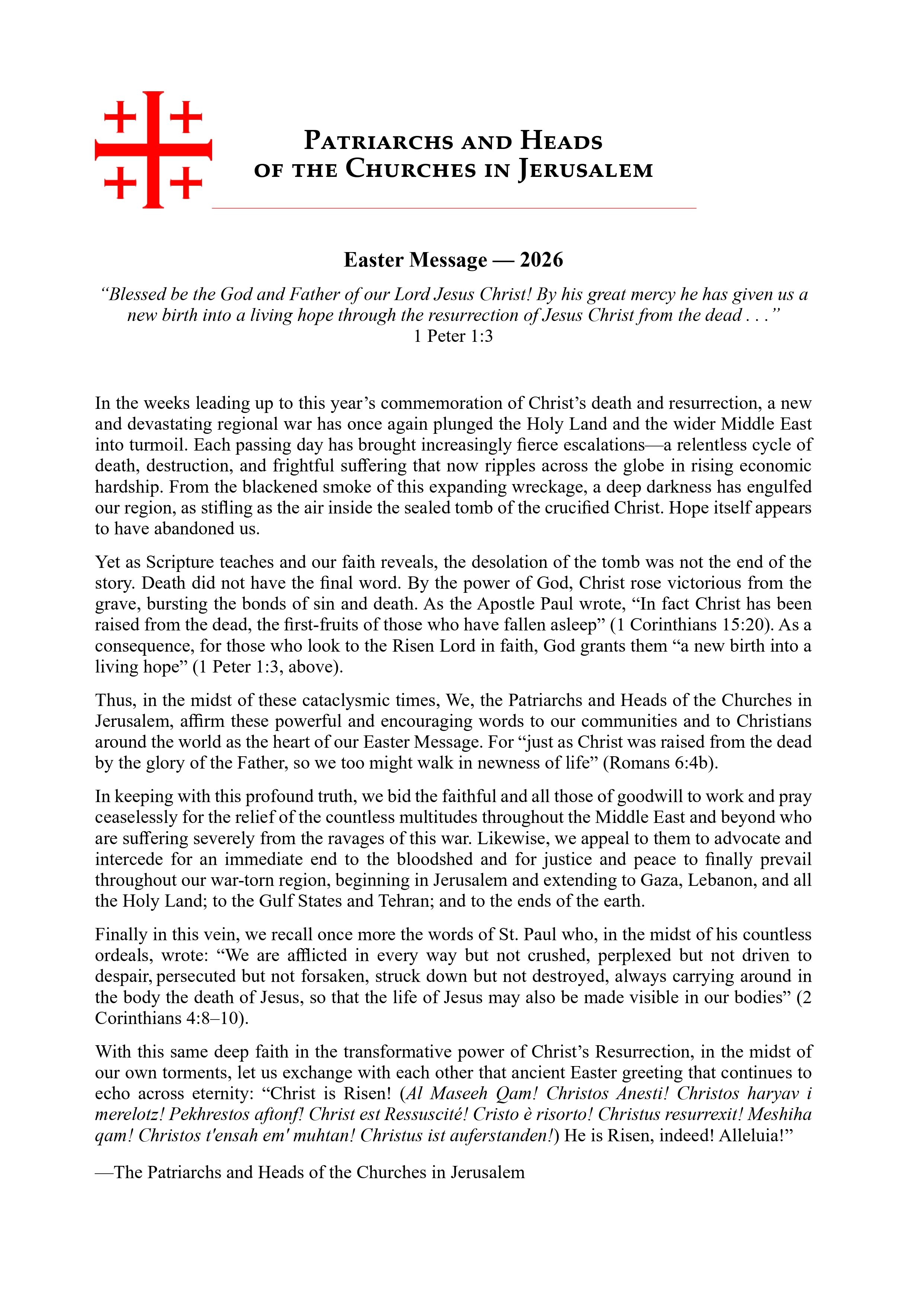 Easter Message 2026 - Patriarchs and Heads of Churches in Jerusalem