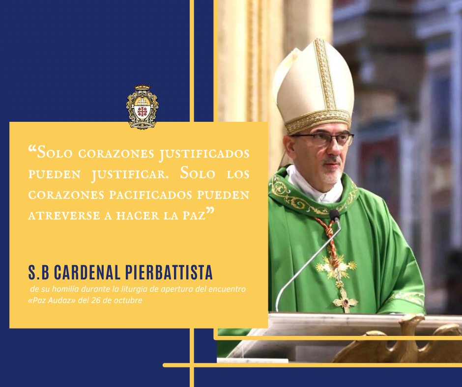 "Solo quienes reconocen su fragilidad y necesidad de misericordia pueden convertirse en instrumentos de reconciliación…. Solo corazones justificados pueden justificar. Solo los corazones pacificados pueden atreverse a hacer la paz," dijo Su Beatitud Cardenal Pierbattista Pizzaballa, Patriarca Latino de Jerusalén, en su homilía en San Juan de Letrán en Roma, el 26 de octubre de 2025, mientras presidía la Liturgia Eucarística que abrió el Encuentro Internacional organizado por San Egidio titulado "Atrévete a la Paz".