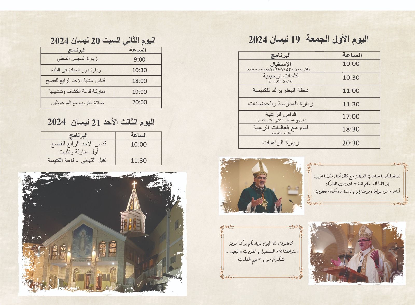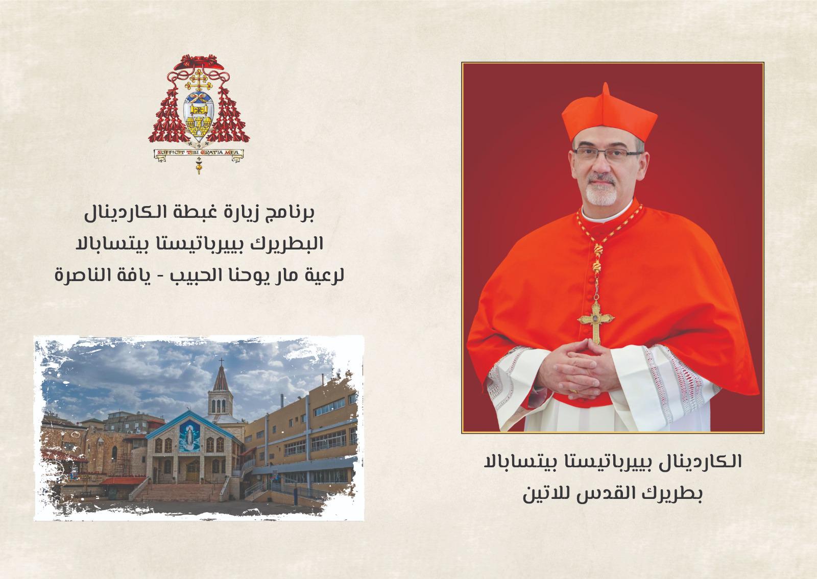 سيبدأ غبطة الكاردينال بييرباتيستا بيتسابالا، بطريرك القدس للاتين زيارته الراعوية لتفقد أحوال رعية يافة الناصرة يوم الجمعة 19 نيسان ولغاية يوم الأحد 21 نيسان 2024.