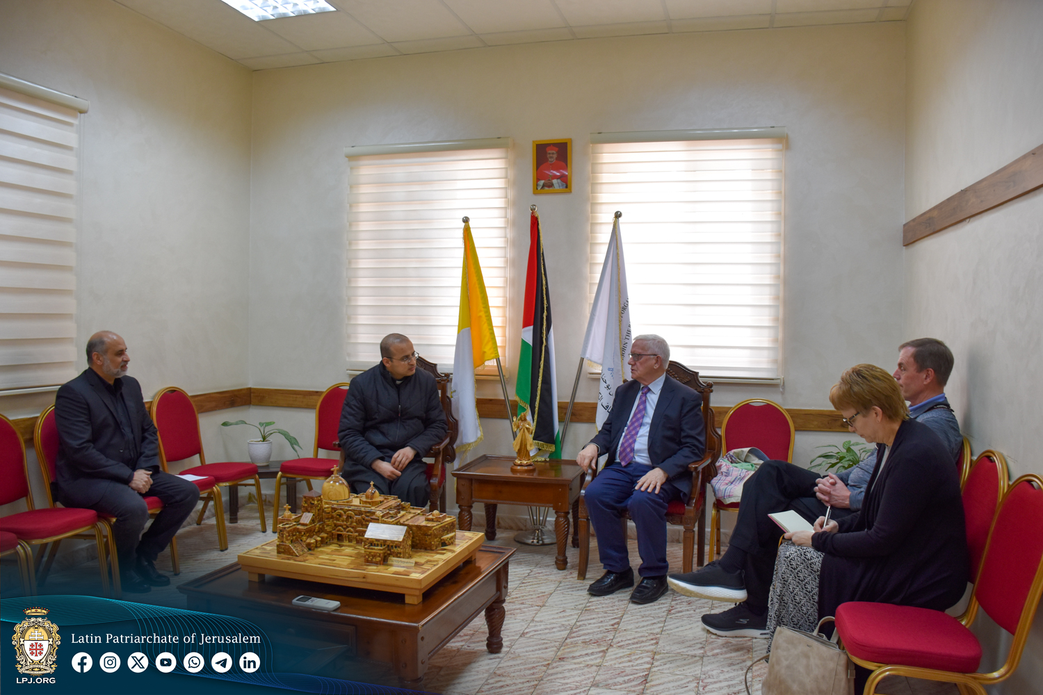 ترأس الزيارة السيد سامي اليوسف، الوكيل العام للبطريركية اللاتينية، الذي عبر عن سعادته لزيارة اللجنة قائلاً: "نحن ممتنون لزيارة أعضاء لجنة الأراضي المقدسة، وخاصة على إصرارهم على المجيئ، ليس فقط من أجل عقد اللقاءات العملية المنتظمة والزيارات الميدانية السنوية، ولكن الأهم من ذلك هو زيارتهم التضامنية لأنهم أرادوا أن يكونوا قريبين من إخوانهم وأخواتهم في الأراضي المقدسة والاستماع إلى تحدياتهم. إن زياراتهم إلى المؤسسات والرعايا والمدارس ومنازل العائلات المحتاجة التي تضررت بشدة بسبب الحرب أعطتهم نظرة واضحة للقضايا التي تتعامل معها كنيسة في الأرض المقدسة. لقد كانت اللقاءات والمناقشات إستراتيجية وغنية، والتي تعززالعلاقة بين البطريركية اللاتينية وجمعية فرسان القبر المقدس".