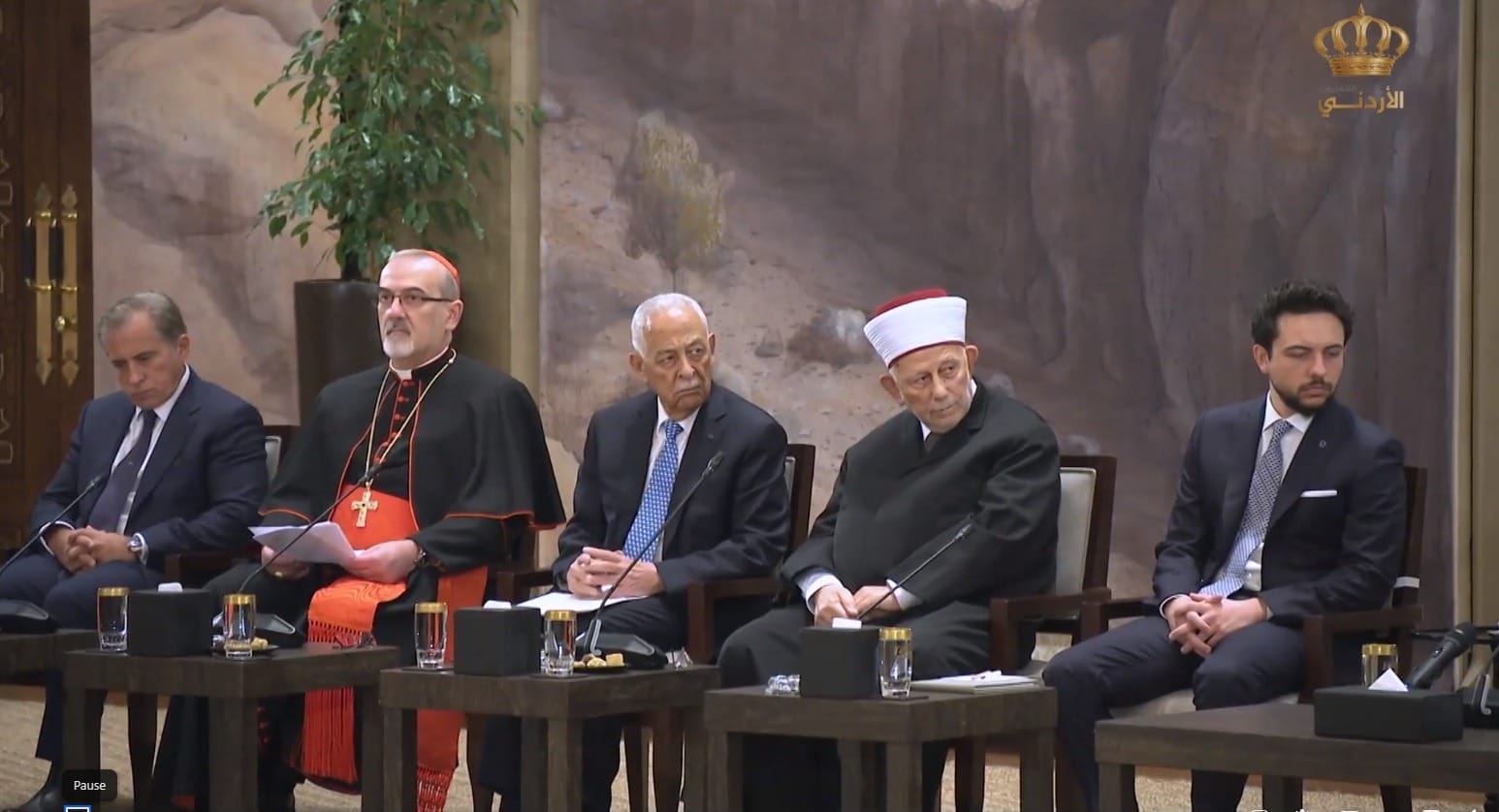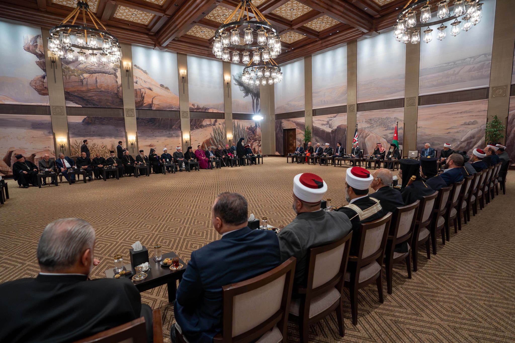 El miércoles 20 de diciembre de 2023, Su Majestad el Rey Abdullah II, acompañado por Su Alteza Real el Príncipe Heredero Al Hussein, se reunió con personalidades religiosas jerosolimitanas y jordanas en el Palacio Al Husseiniya para subrayar la posición clara e inquebrantable de Jordania hacia la causa palestina y la agresión contra Gaza.