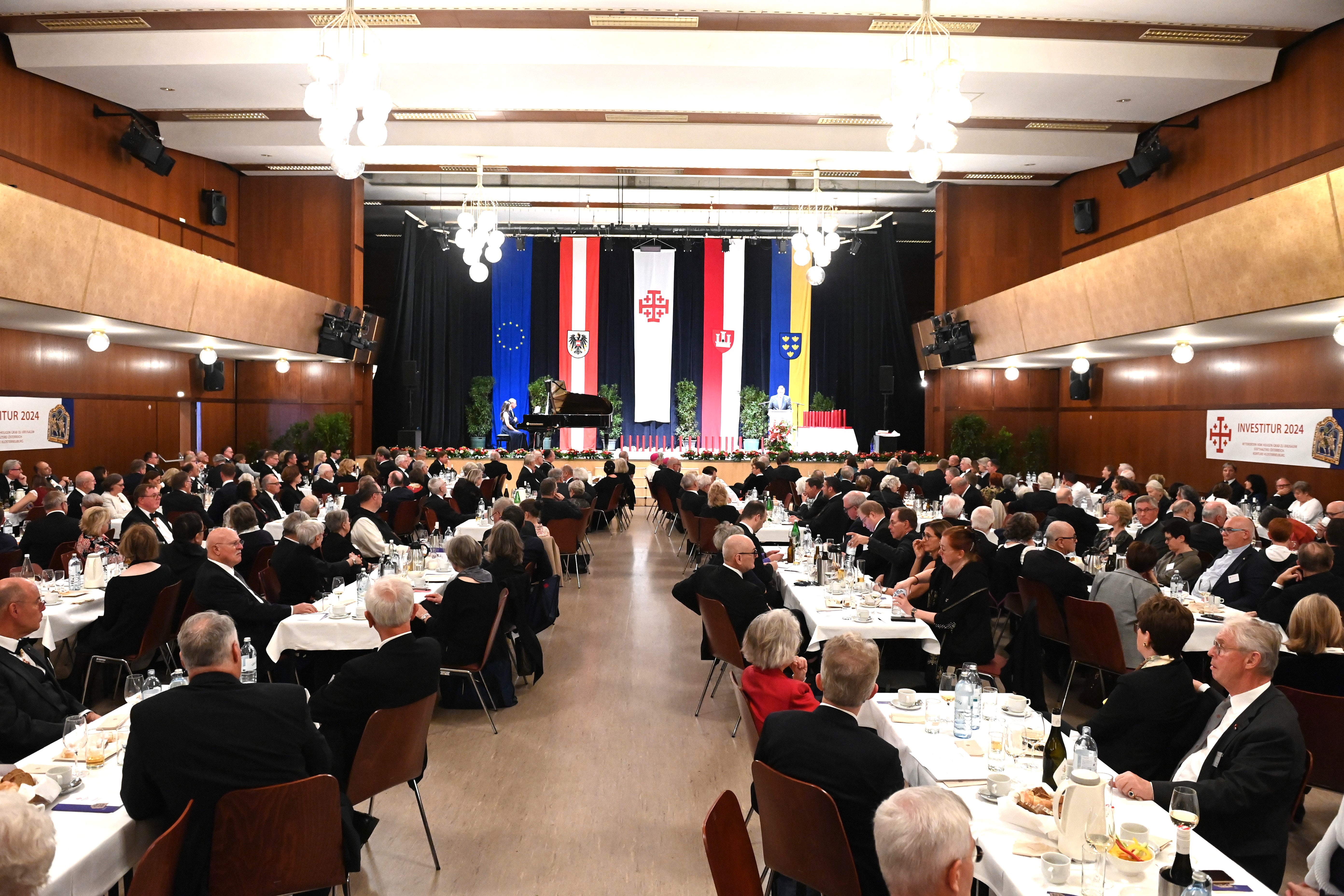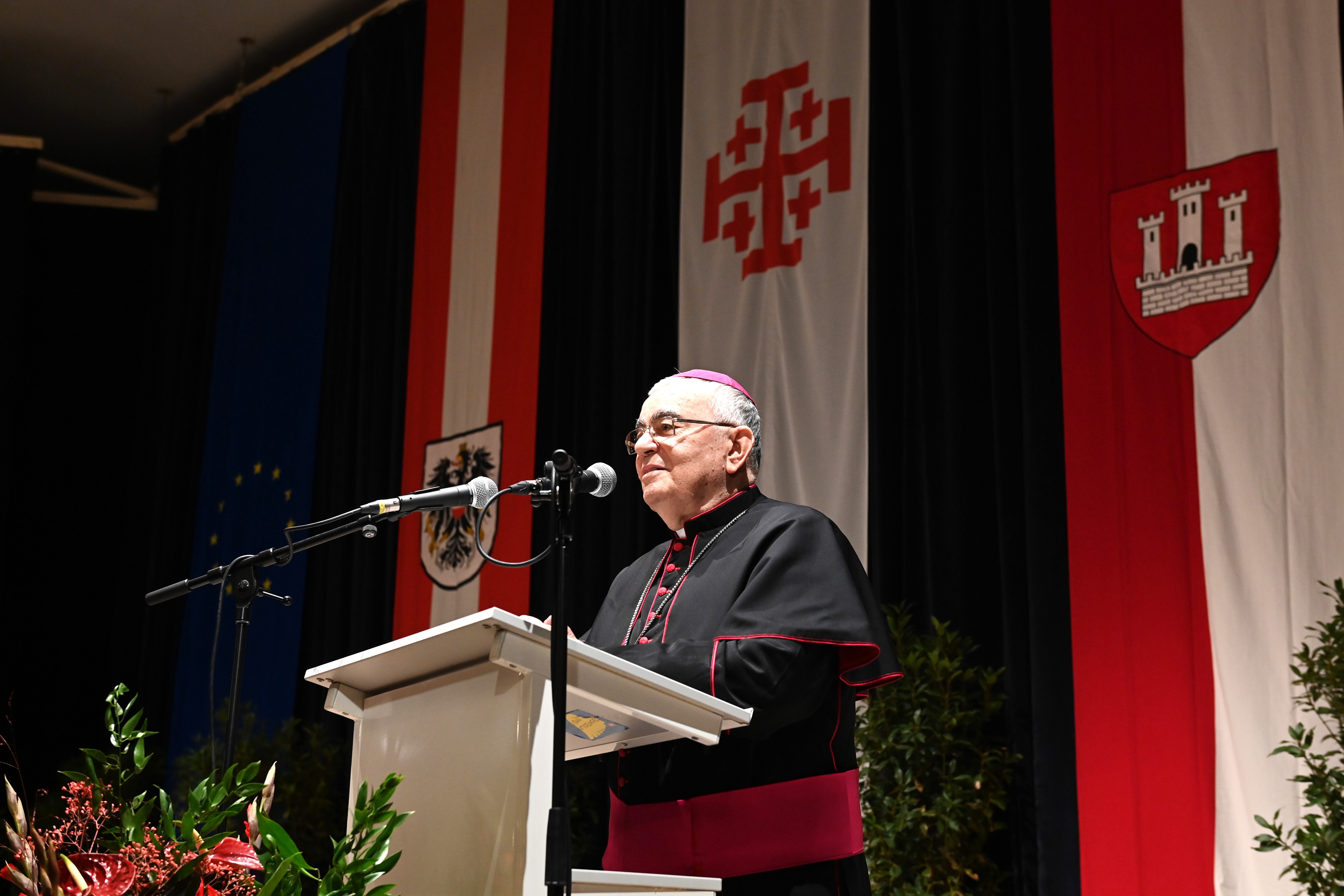 Mgr Giacinto-Boulos Marcuzzo a pris la parole au nom du Patriarche latin de Jérusalem, exprimant sa gratitude envers les Chevaliers pour leur soutien constant à la Terre Sainte, et soulignant en particulier les contributions de la Lieutenance autrichienne à des projets particuliers au cours de l'année écoulée. Il a fait le point sur la situation désastreuse à Gaza et dans le nord d'Israël et a remis des marques d'appréciation à plusieurs dirigeants, ainsi qu'une photo et une prière de la sainte palestinienne, Sœur Mariam Baouardy.