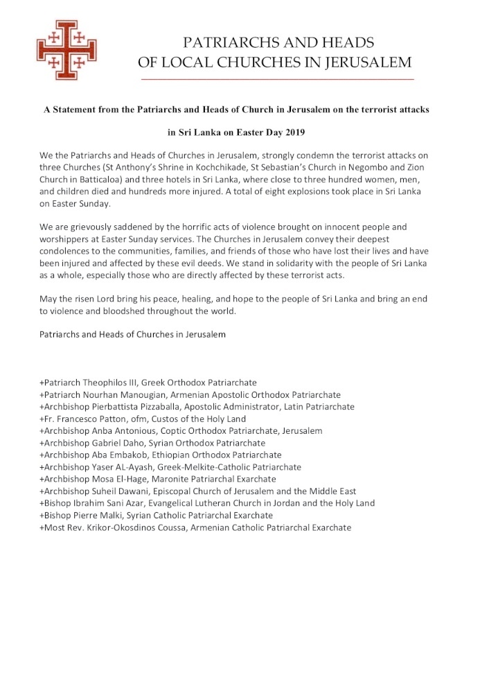 A Statement from the Patriarchs and Heads of Church in Jerusalem on the terrorist attacks in Sri Lanka on Easter Day 2019