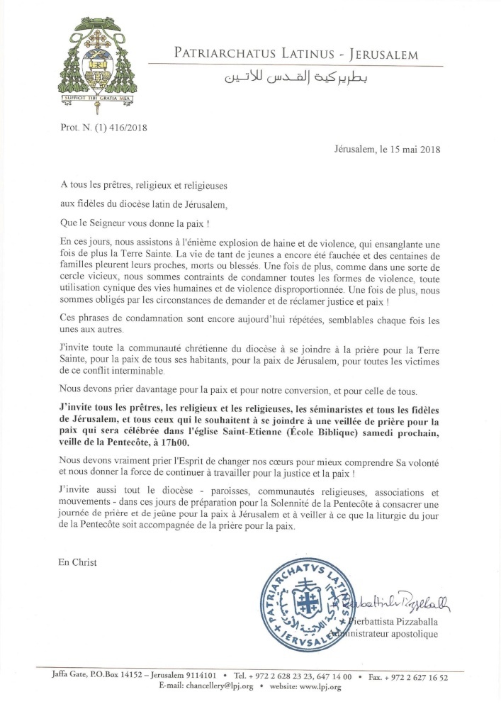 J’invite tous les prêtres, les religieux et les religieuses, les séminaristes et tous les fidèles de Jérusalem, et tous ceux qui le souhaitent à se joindre à une veillée de prière pour la paix qui sera célébrée dans l’église Saint-Etienne (École Biblique) samedi prochain, veille de la Pentecôte, à 17h00.