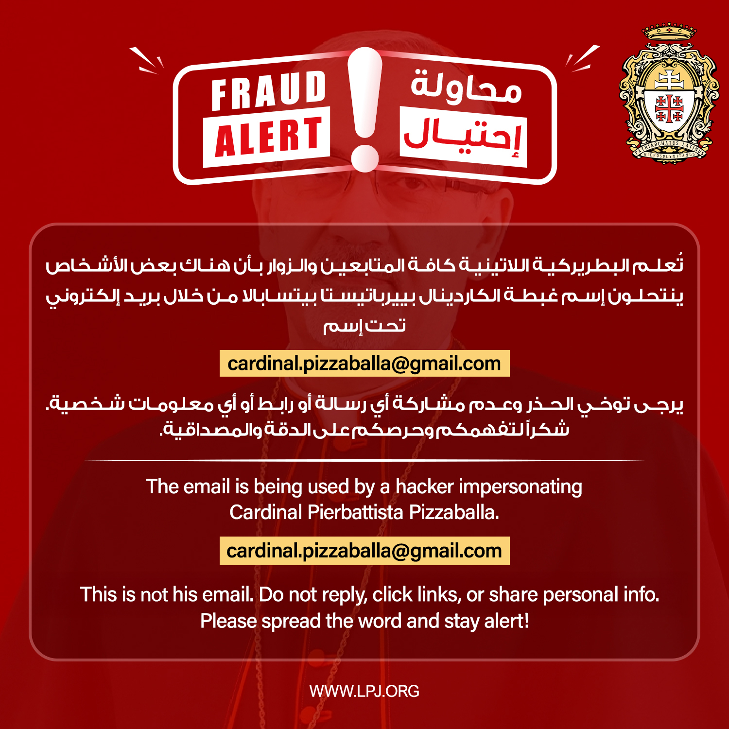 L’indirizzo email [email protected] è utilizzato da un hacker che si spaccia per il Cardinale Pierbattista Pizzaballa.